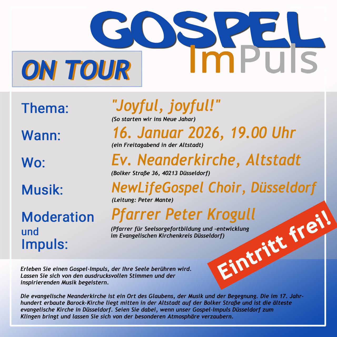 Upcoming Events 2026 Januar 14.01.2026 – Florence Nightingale – Düsseldorf-Kaiserswerth – Privat16.01.2026 – 19:00 Uhr – Gospelnacht – Neanderkirche, Bolker Str. 36, Düsseldorf – Eintritt frei